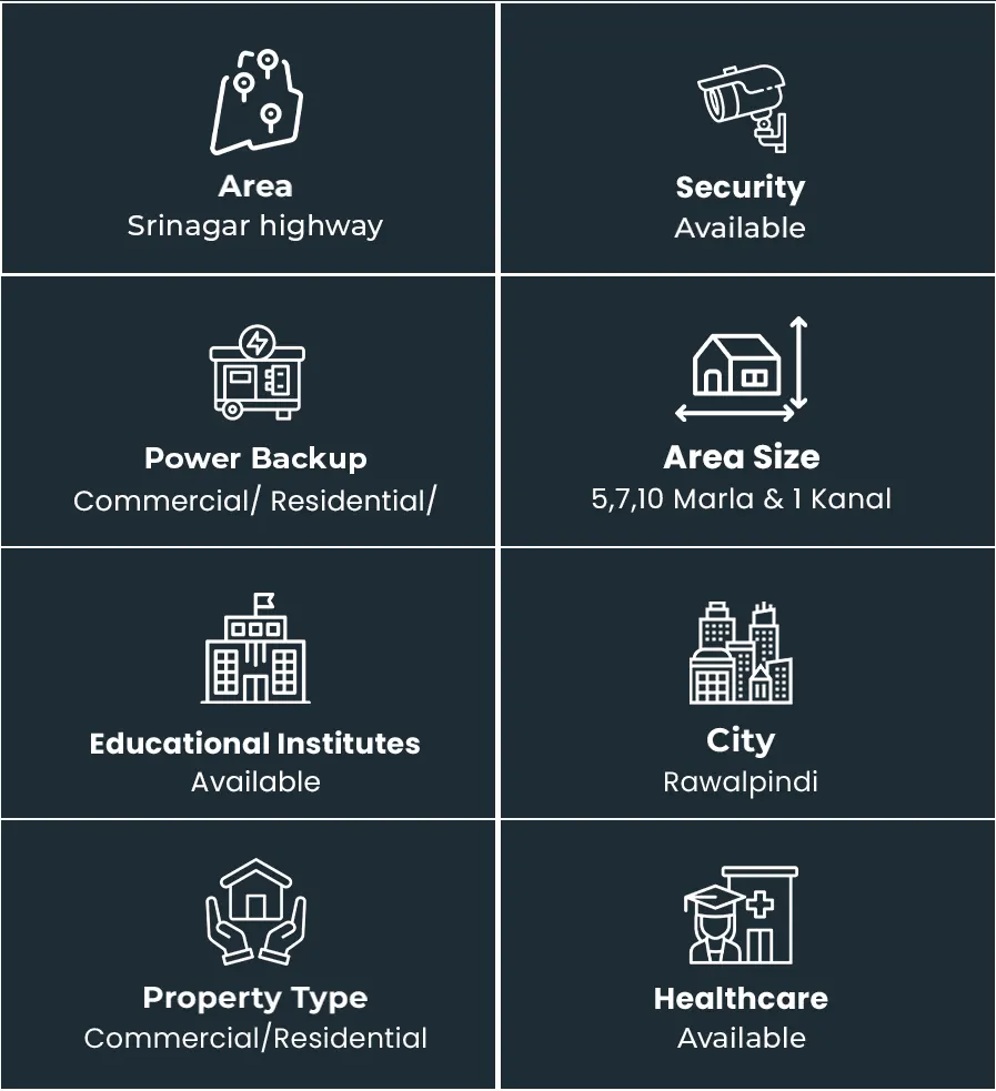 The proposed master plan is ideally planned to have wide streets, green belts and facilities necessary like parks, mosques, and well established schools. These plots will be provided by the developers at a flexible payment plan and no extra transfer price. They will be an ideal choice for anyone who wants to build their ideal house or to make an investment in a secure and high yield area of Rawalpindi.