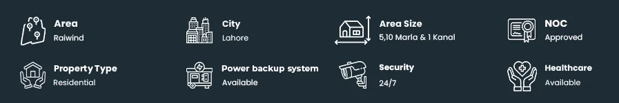 Well-developed societies to the project include Bahria Orchard, Lake City, Valencia Town and Raiwind City. Such an ideal location will guarantee easy access to schools, hospitals, shopping malls, and commercial centers