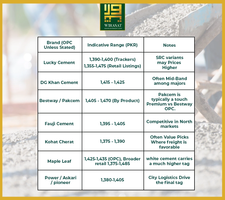 • A tracker list dated late September showed: Bestway 1,405–1,415, Pakcem 1,430–1,440, DG Khan 1,415–1,425, Fauji 1,395–1,405, Lucky 1,390–1,400, Kohat 1,380–1,390, Cherat 1,375–1,385, Maple Leaf 1,425–1,435, Power 1,380–1,390, Askari 1,385–1,395, Pioneer 1,395–1,405 — useful as a cross-check before you call local dealers.